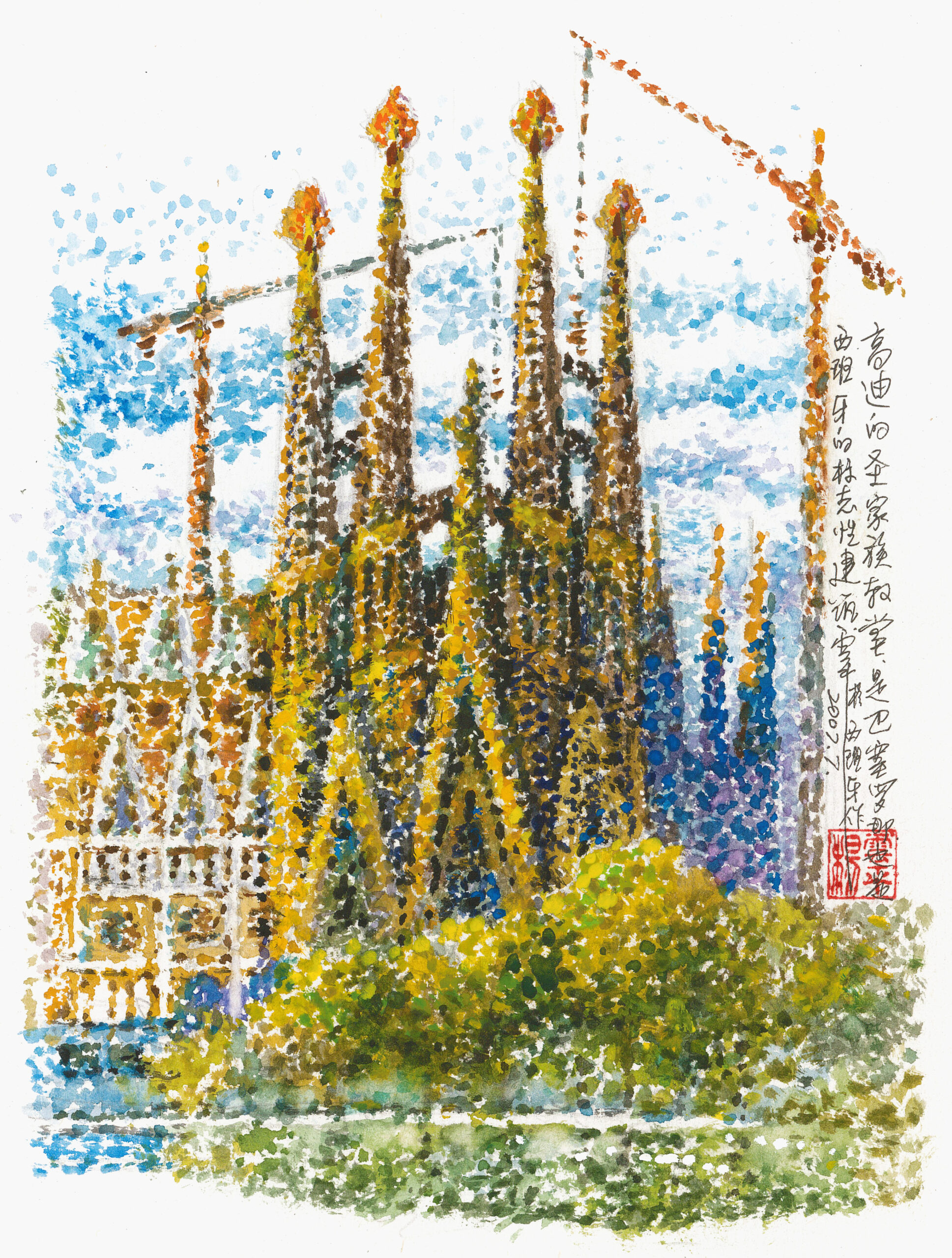 Located in the northeast of Spain, Barcelona is known as the “City of Gaudi” because of many masterpieces of master architect Gaudi, including Casa Batlló, Casa Milà, and Park Güell. In particular, the Sagrada Família, which has been under construction for more than a century, has become a world cultural heritage and is extremely legendary. In 2007, when its top was not yet equipped with shining stars, I painted it using the stippling technique of Neo-impressionism, and the step-by-step painting process was very enjoyable.