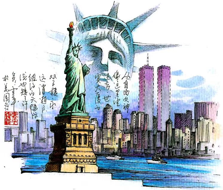 自由女神像是1884年美国独立110周年时法国人赠送的礼物,现成了美国价值观的体现与象征。游画它,我还用虚线勾勒出了已消逝的纽约世贸大厦双子楼,以祭奠“9·11”无辜受难者。