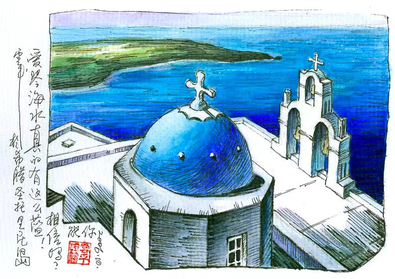 圣托里尼是希腊爱琴海中最美的岛屿之一,我的游画前景是沐着柔和阳光的教堂圆顶,中景是竖着十字架的教堂钟楼,远景是像海豚样调皮地伸展着尖吻的岩石,自然美与人工美浑成了一体。