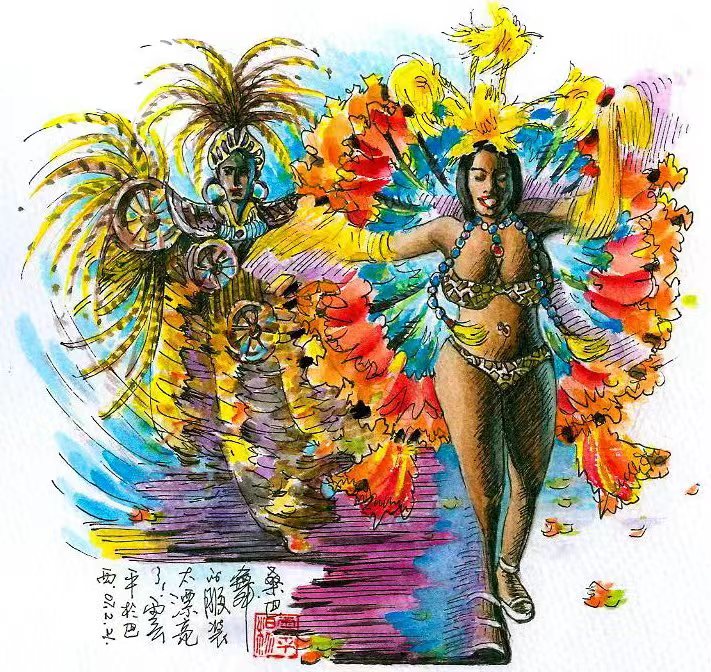世界上很多地方有狂欢节,但巴西的最有名;巴西每个城市都有狂欢节,但里约热内卢的最具规模,游画里约狂欢节,我描绘了桑巴舞表演,舞蹈热烈,情感热烈,色彩热烈,我的笔触也非常热烈。